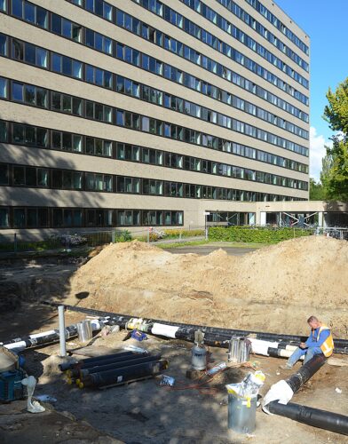 De container met daarin de tijdelijke ketel van het warmtenet in Park Selwerd om de kamers warm te houden, is weg. Daarmee is de hoofdleiding van Warmtestad klaar en in gebruik. Studentenflat de Dragant is onlangs aangesloten en op termijn gebeurt dat met veel meer woningen.